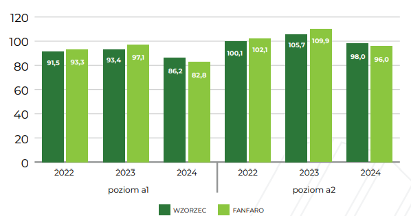 | Plon ziarna [dt/ha] pszenżyta ozimego odmiany FANFARO doświadczeniach PDO COBORU 2022-2024 |